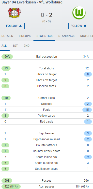 Hab das Spiel nicht gesehen, aber rein anhand der Zahlen hat Leverkusen das Spiel dominiert/kontrolliert (siehe Ballbesitz und gespielte Pässe) , WOB hat gut verteidigt und war halt 2x eiskalt und anscheinend gut im Umschaltspiel. Ähnlich wie der WAC in Graz oder beim Lask, da wussten die nachher auch nicht wieso sie eigentlich gewonnen haben. So in etwa würde ich dieses Zahlenmaterial interpretieren 😊