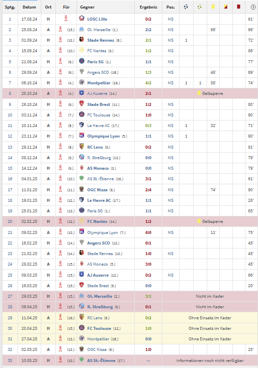 salzmann https://www.transfermarkt.at/oumar-diakite/leistungsdatendetails/spieler/847279/wettbewerb/FR1/saison/2024 Bei Oumar Diakite und Reims läuft es in dieser Saison auch nicht so wirklich. Reims selbst kann am letzten Spieltag noch absteigen und Diakite hat auch keine große Rolle in den letzten Wochen gespielt. Bei der heutigen 0:2 Niederlage gegen St. Etienne stand er nicht einmal im Kader. Sein letztes Tor hat er Ende November geschossen