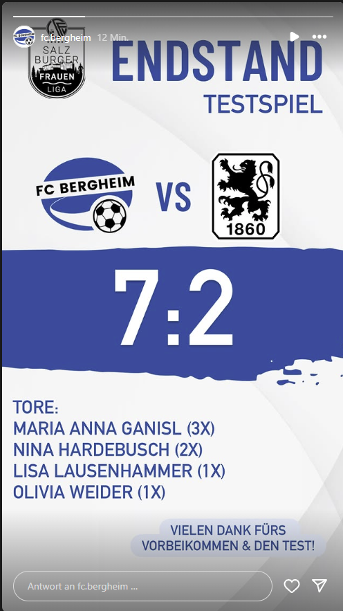 salzmann https://www.oefb.at/bewerbe/Spiel/Spielbericht/3836714/?SG-FC-Bergheim-RB-Salzburg-Frauen-1c-SFL-vs-TSV-1860-Muenchen-I-DEU- die SG FC Bergheim / RB Salzburg Frauen 1c hat ihr Testspiel gegen 1860 München mit 7:2 gewonnen. Die Torschützen: 2x Ganisl, 2x Hardebusch, Lausenhammer und Weider. Für das 7. Tor ist kein Torschütze eingetragen, also war es möglicherweise ein Eigentor