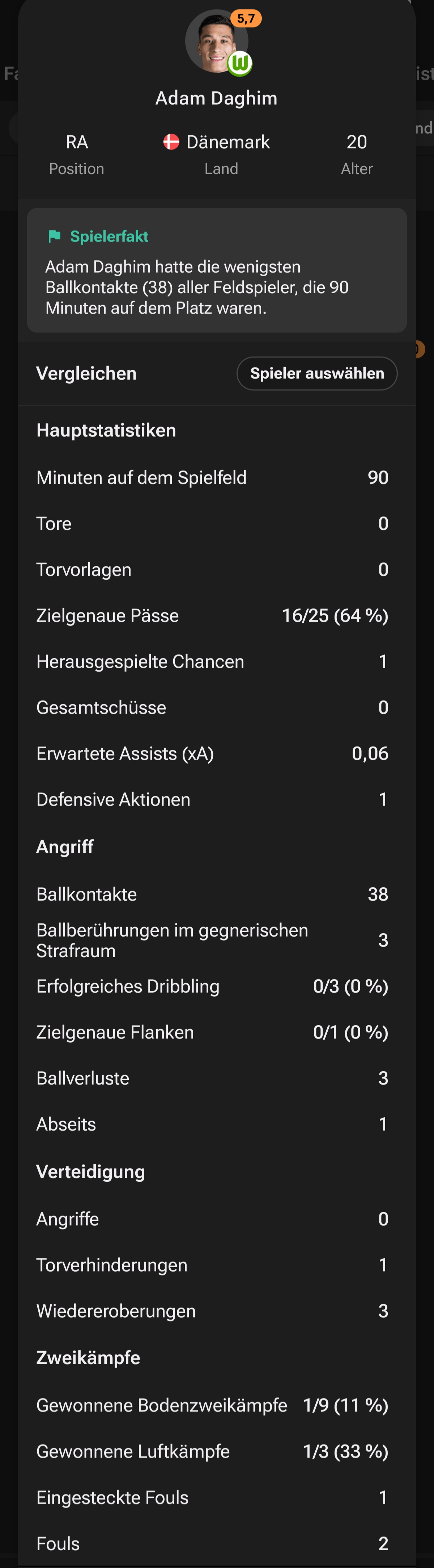 chrischinger86 Daghim am 1:0 von Wolfsburg mit beteiligt, seinen Mitspieler hat er einfach auf rechts im Vollsprint fast über den Haufen gerannt und dann doch überholt.