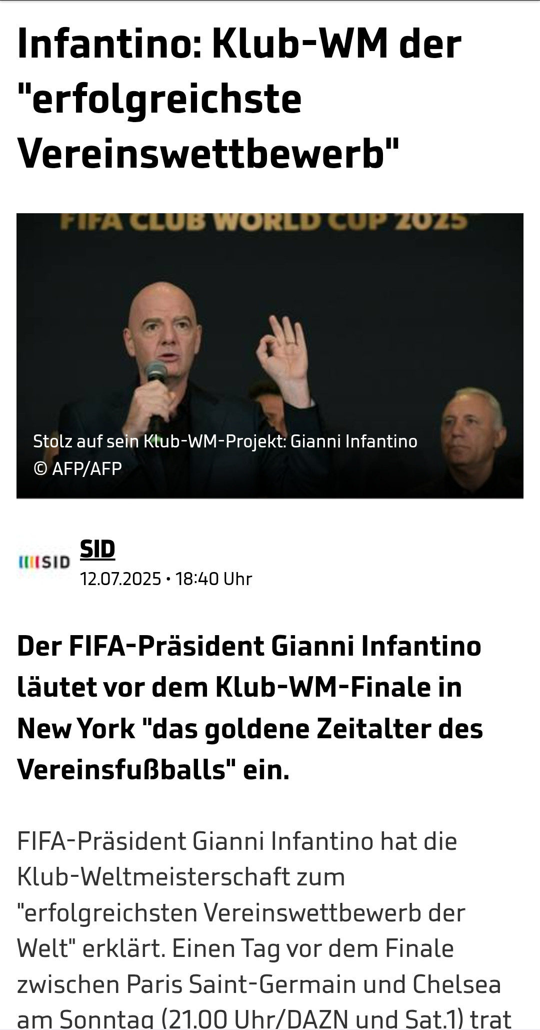 pascalp1933 HunglikeHodor Voller Erfolg Die Klub-WM ist ein voller Erfolg: Spiele wie FC Cocaina Tijuana vs. Real Madrid oder Sushi-Nintendo Kyoto vs. Manchester City locken in den USA aktuell bis zu zwei Zuseher vor den Fernseher und fünf Zuseher in die Stadien. Dass das Turnier in den USA ausgetragen wird, sieht Fußball-Fan Edmund Lindau kritisch: „Kann man das nicht ganz normal in Katar oder Saudi-Arabien machen, anstatt so einem Schurkenstaat den Bewerb zu geben?“ Besonders genervt sind die Fans auch von den oft bis zu vier Stunden dauernden Spielunterbrechungen. In den USA ist es gesetzlich vorgeschrieben, dass Outdoor-Bewerbe unterbrochen werden müssen, wenn im Umkreis von zehn Meilen ein Hurrikan oder ein Transgender-Demokrat aufzieht. Geldmacherei? Die Kritik, der Bewerb sei eine reine Geldmacherei der FIFA, lässt Chef Gianni Infantino nicht gelten: „Bei aller Liebe zur Geldmacherei und Korruption: Das ist Blödsinn“, bekräftigt er und beißt in sein 18-Karat-Goldsteak, während ihm drei FIFA-Funktionäre die Glatze mit feinstem Olivenöl einreiben. Um die Spieler noch besser monetarisieren zu können, plant die FIFA bereits für Ende Juli eine Klub-World-League in Abu Dhabi und für Anfang August eine Klub-Nations-League in Nordkorea. https://dietagespresse.com/klub-wm-zu-langweilig-mbappe-schaut-waehrend-spiel-am-handy-anderes-match/
