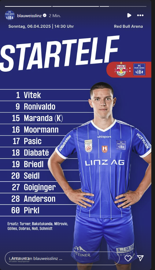 salzmann Ultimate84 bis auf Sulzbacher für Capaldo und Mundl Baidoo für Yeo ist das die selbe Startelf, die vor einer Woche Auswärts gegen Rapid souverän gewonnen hat