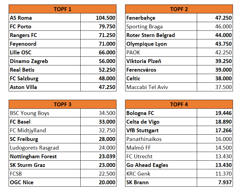 barracuda Topf 1 steht schon mal fest. So schaut die Topfeinteilung aus, wenn man von gesetzten Aufsteigern im EL-Playoff ausgeht. Kann sich natürlich noch ändern. Fettgedruckt sind fixteilnehmende Teams: