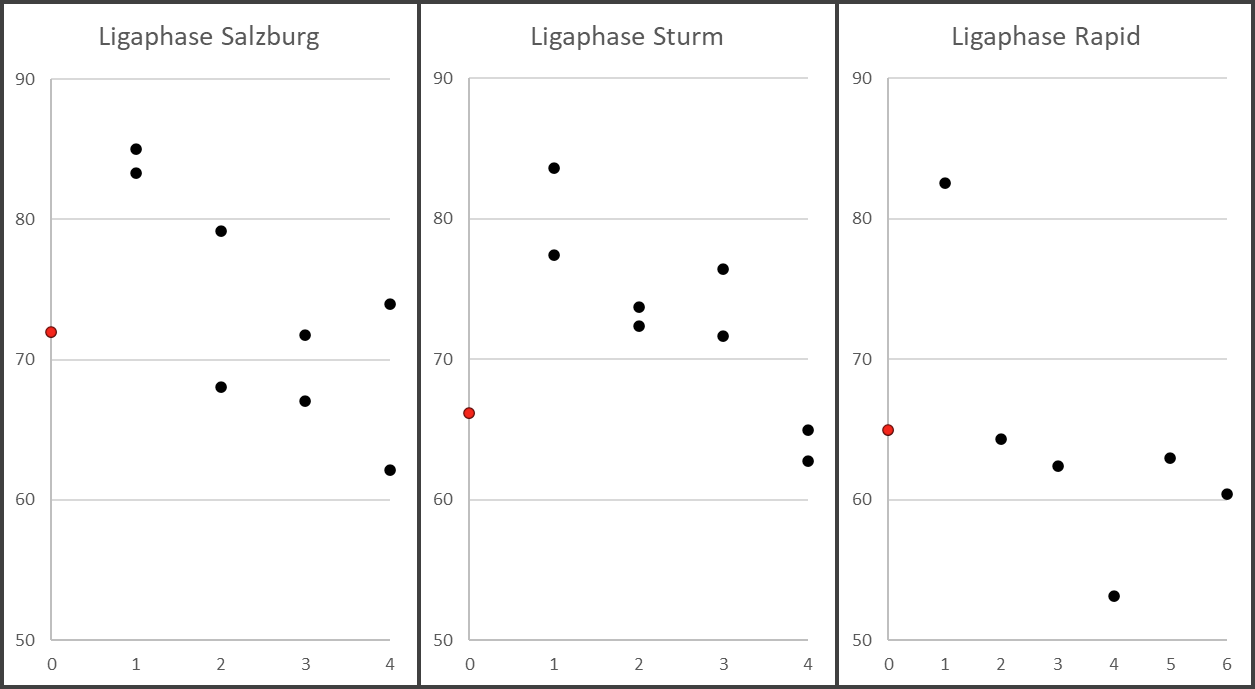 Salzburg: klar schwächer als Porto, Aston Villa, Lyon; auf Augenhöhe mit Ferencváros, Basel, Freiburg, Bologna; klar stärker als Go Ahead Eagles. Tipp: 8 Punkte