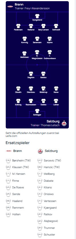 chrischinger86 Aufstellungen: https://www.uefa.com/uefachampionsleague/match/2045379--brann-vs-salzburg/ Gloukh in der Startelf Let the rage begin