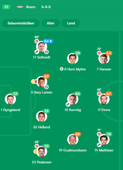 - Linksverteidiger Soltvedt bringt die Ecken, sofern ich das richtig gesehen habe; spielte sehr abgeklärt; müsste mit dem Tor und Assist im heutigen Spiel (insgesamt zwei Tore, fünf Assists) nun zusammen mit Myhre bester Scorer im Team sein