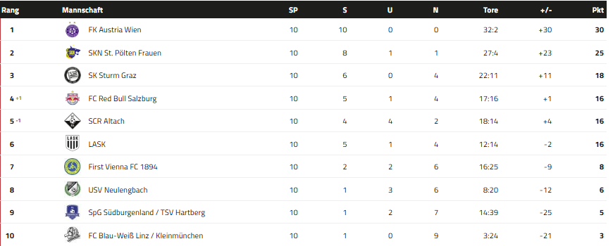 salzmann https://www.oefb.at/oefb/Bewerbe/Frauen/ADMIRAL-Frauen-Bundesliga/Tabelle Nachdem jetzt die Länderspielpause ansteht, kann man mal einen kurzen Blick auf die Tabelle werfen. Unsere Mannschaft befindet sich nach 10. Spieltagen auf dem 4. Tabellenplatz und wäre damit aktuell in der Meistergruppe mit dabei. Nach der Länderspielpause folgen gleich die direkten Duelle gegen Altach und den LASK, die mit unserer Mannschaft aktuell punktegleich sind