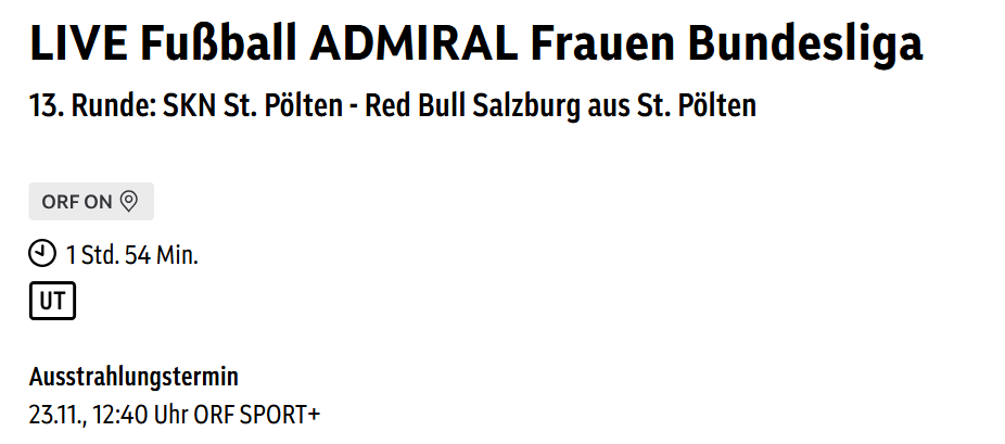 salzmann https://tv.orf.at/program/orfs/livefussba1564.html nächste Woche gibt es eine Premiere. Erstmals wird mit der Begegnung gegen St. Pölten eine Partie unserer FC Red Bull Salzburg Frauen im Free TV (bei ORF Sport+) übertragen (Sonntag, 23.11 Spielbeginn 12:45 Uhr)