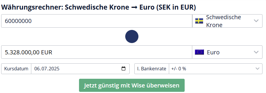 salzmann Djurgarden möchte anscheinend für ihn 60 Millionen schwedische Kronen, also ca. 5,3 Millionen Euro. https://www.finanzen.net/waehrungsrechner/schwedische-krone_euro?amount=60000000&date=2025-07-06&interbankrate=0