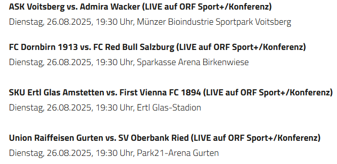 salzmann aXXit https://www.oefb.at/cup/News/Spieltermine-fuer-2-Runde-im-UNIQA-OeFB-Cup-fixiert/ 4 Spiele ASK Voitsberg vs. Admira Wacker (LIVE auf ORF Sport+/Konferenz) Dienstag, 26.08.2025, 19:30 Uhr, Münzer Bioindustrie Sportpark Voitsberg FC Dornbirn 1913 vs. FC Red Bull Salzburg (LIVE auf ORF Sport+/Konferenz) Dienstag, 26.08.2025, 19:30 Uhr, Sparkasse Arena Birkenwiese SKU Ertl Glas Amstetten vs. First Vienna FC 1894 (LIVE auf ORF Sport+/Konferenz) Dienstag, 26.08.2025, 19:30 Uhr, Ertl Glas-Stadion Union Raiffeisen Gurten vs. SV Oberbank Ried (LIVE auf ORF Sport+/Konferenz) Dienstag, 26.08.2025, 19:30 Uhr, Park21-Arena Gurten