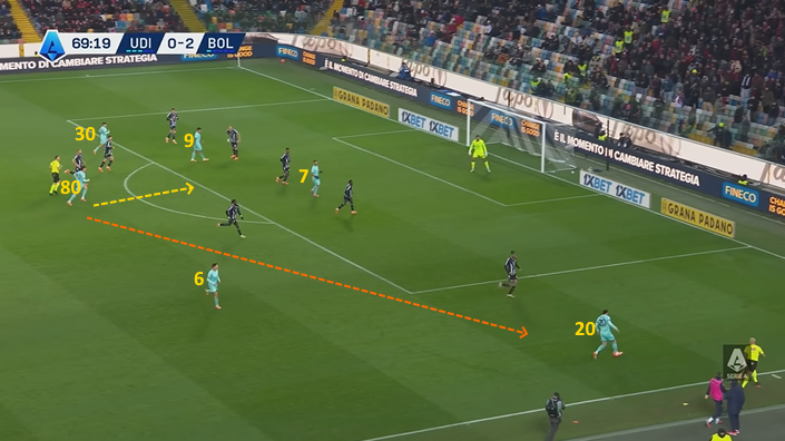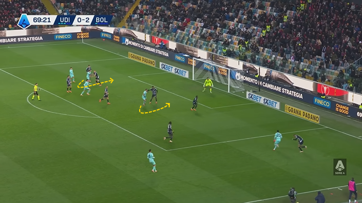 Orsolini (7) und Castro (9) driften zuerst auseinander und öffnen die Schnittstelle zwischen den IV. Als Zortea sich für die Hereingabe befreit hat (Gurkerl), kommen noch einmal Auftaktbewegungen um weiter Raum zu öffnen.