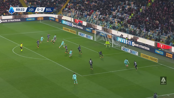 Mittelstürmer lässt sich im Aufbau gerne als Wandspieler tiefer fallen, dann gibt der Zehner Tiefe. Die letzte Linie ist auch in der Breite immer gut besetzt und ins letzte Drittel wird praktisch immer noch einmal auf den Flügel gespielt. Da gefallen mir dann vor allem die abgestimmten Laufwege in der Gefahrenzone. Hier am Beispiel einer Riesenchance gegen Udinese: